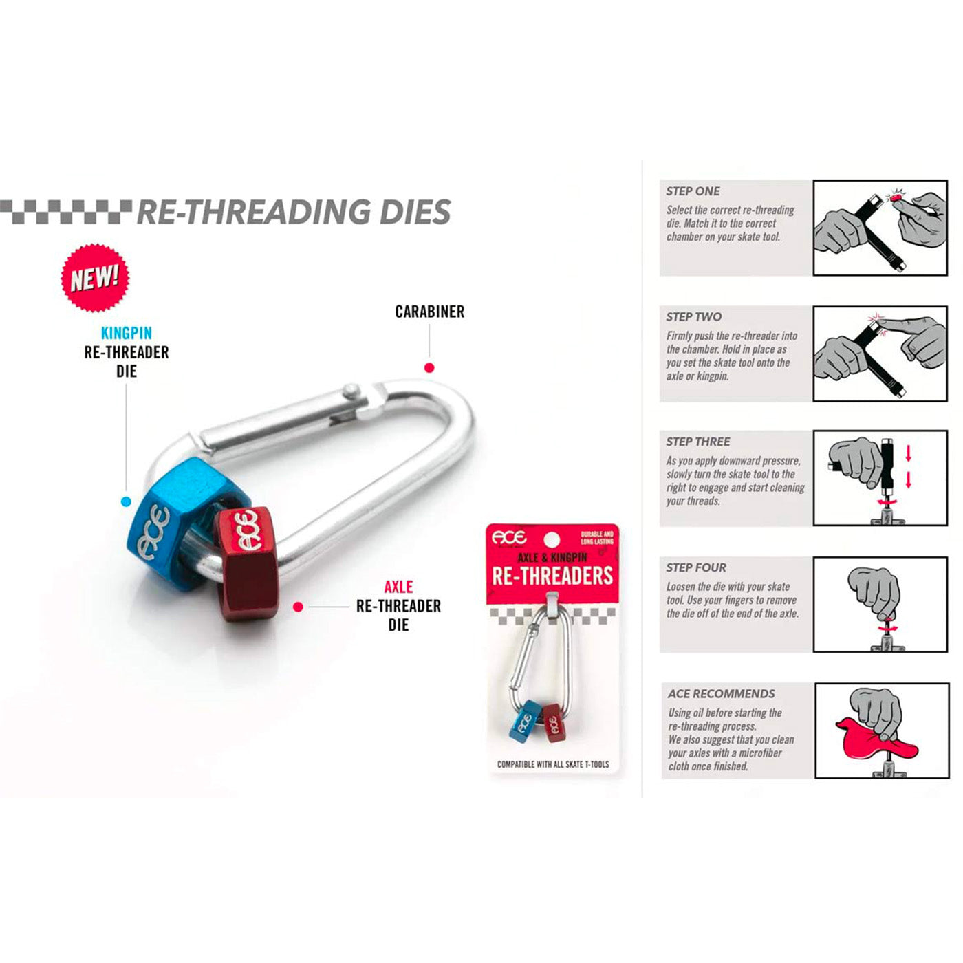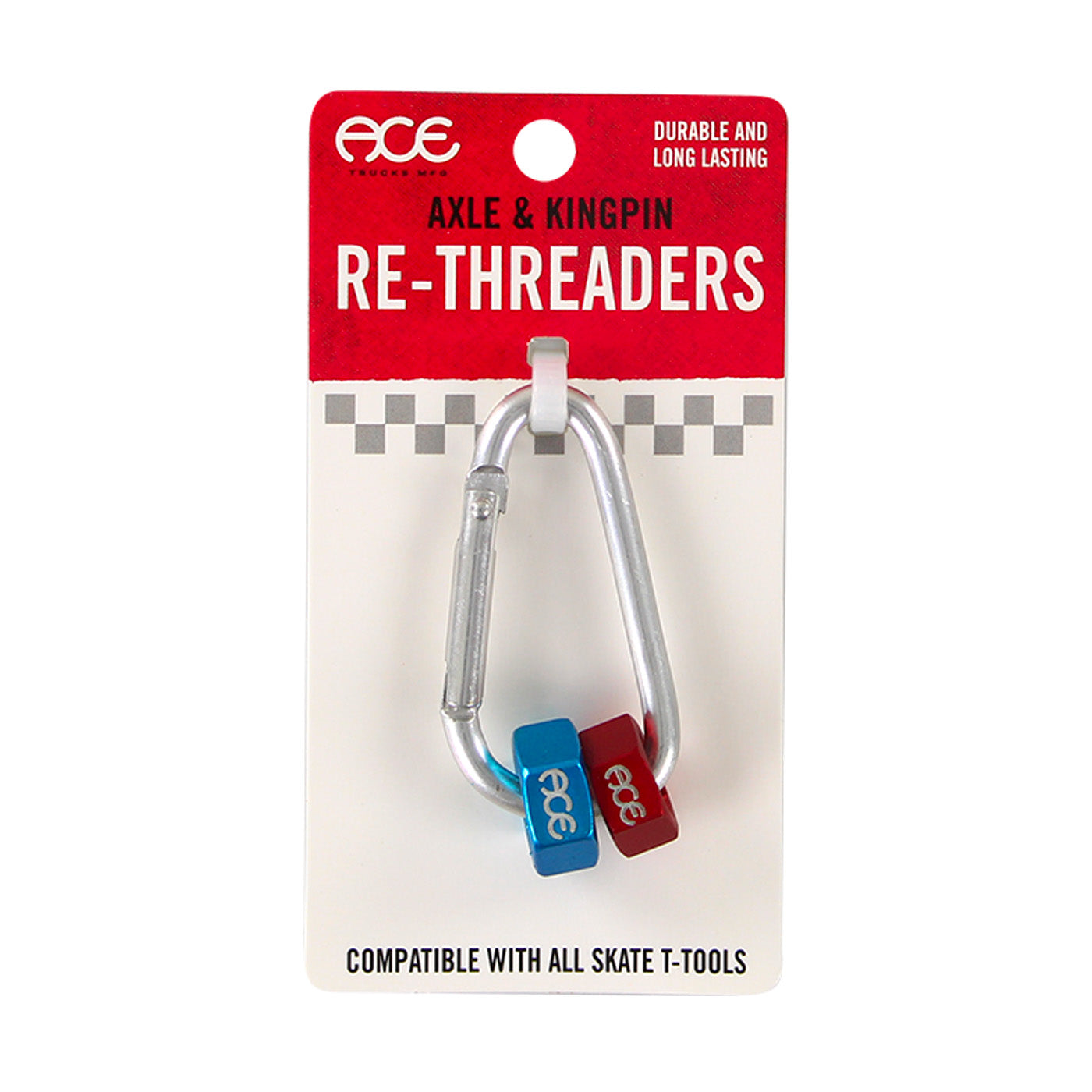 Questi inserti in acciaio temprato sono pensati per essere utilizzati con qualsiasi skate tool o chiave standard. Funzionano come maschi per la ri-filettatura e consentono di ripristinare filettature danneggiate su assi e kingpin, garantendo un accoppiamento corretto e sicuro dei dadi. Il moschettone permette di mantenerli sempre organizzati e facilmente accessibili durante le sessioni.